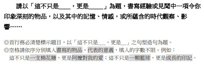 ※勿直接使用說明中的文字進行寫作,引用過多可能影響得分 ※不可在文中洩漏私人身分 ※不可使用詩歌體 |
